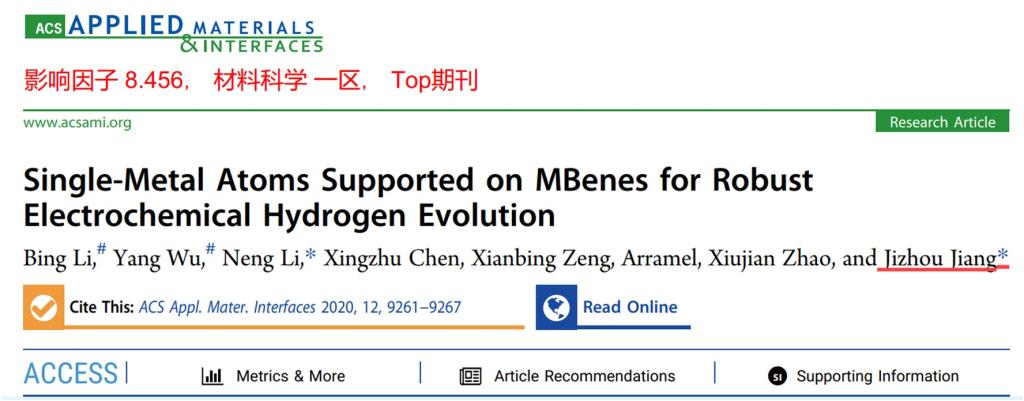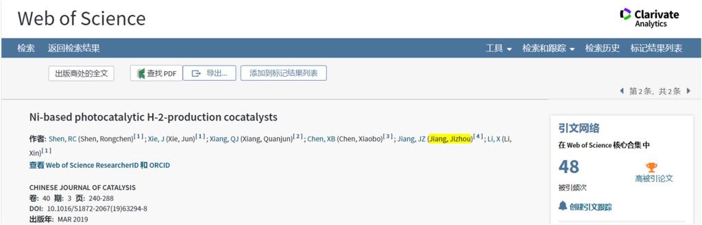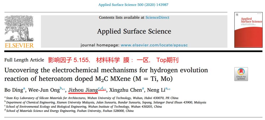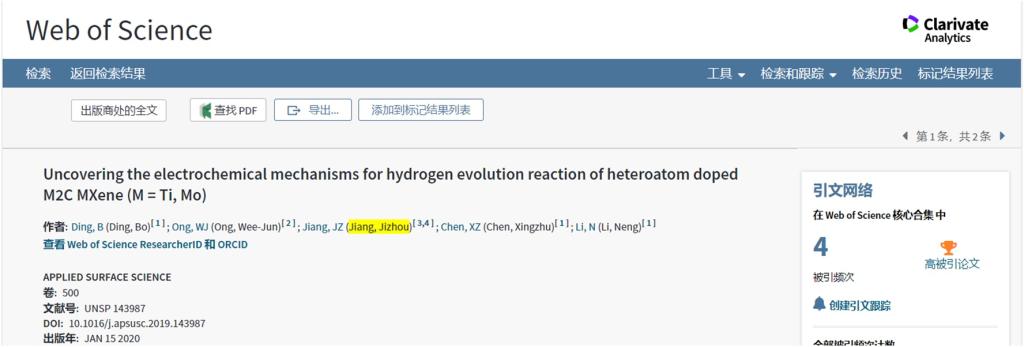 根据最新ESI公布的数据,江吉周博士作为共同通讯作者,发表在期刊《AppliedSurface Science》(影响因子:5.155,Top期刊)上的题为《Uncoveringthe electrochemical mechanisms for hydrogen evolution reaction of heteroatomdoped M2C (M=Ti, Mo) MXenes》的论文,以及作为共同作者,发表在期刊《ChineseJournal of Catalysis》(影响因子:4.914,Top期刊)上的题为《Ni-basedphotocatalytic H2-production cocatalysts》的论文,在五月上旬先后入选高被引论文。来自Web of Science的数据: