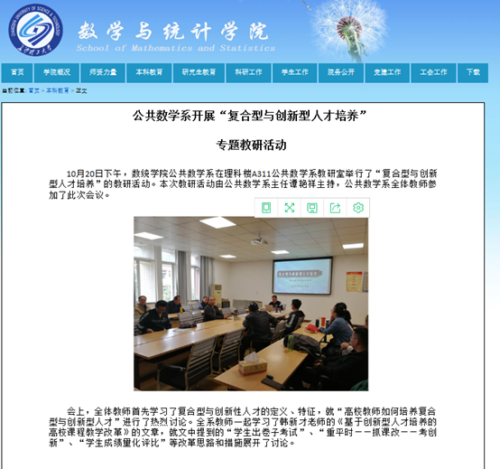 (通讯员 马科)“10月20日下午,数统公司公共数学系,举行‘复合型与创新型人才培养’的教研活动。会上,全体教师首先学习了复合型与创新性人才的定义、特征,就“高校教师如何培养复合型与创新型人才”进行了热烈讨论。全系教师一起学习了韩新才老师的《基于创新型人才培养的高校课程教学改革》的文章,就文中提到的“员工出卷子考试”、“重平时——抓课改——考创新”、“员工成绩量化评比”等改革思路和措施展开了讨论”。